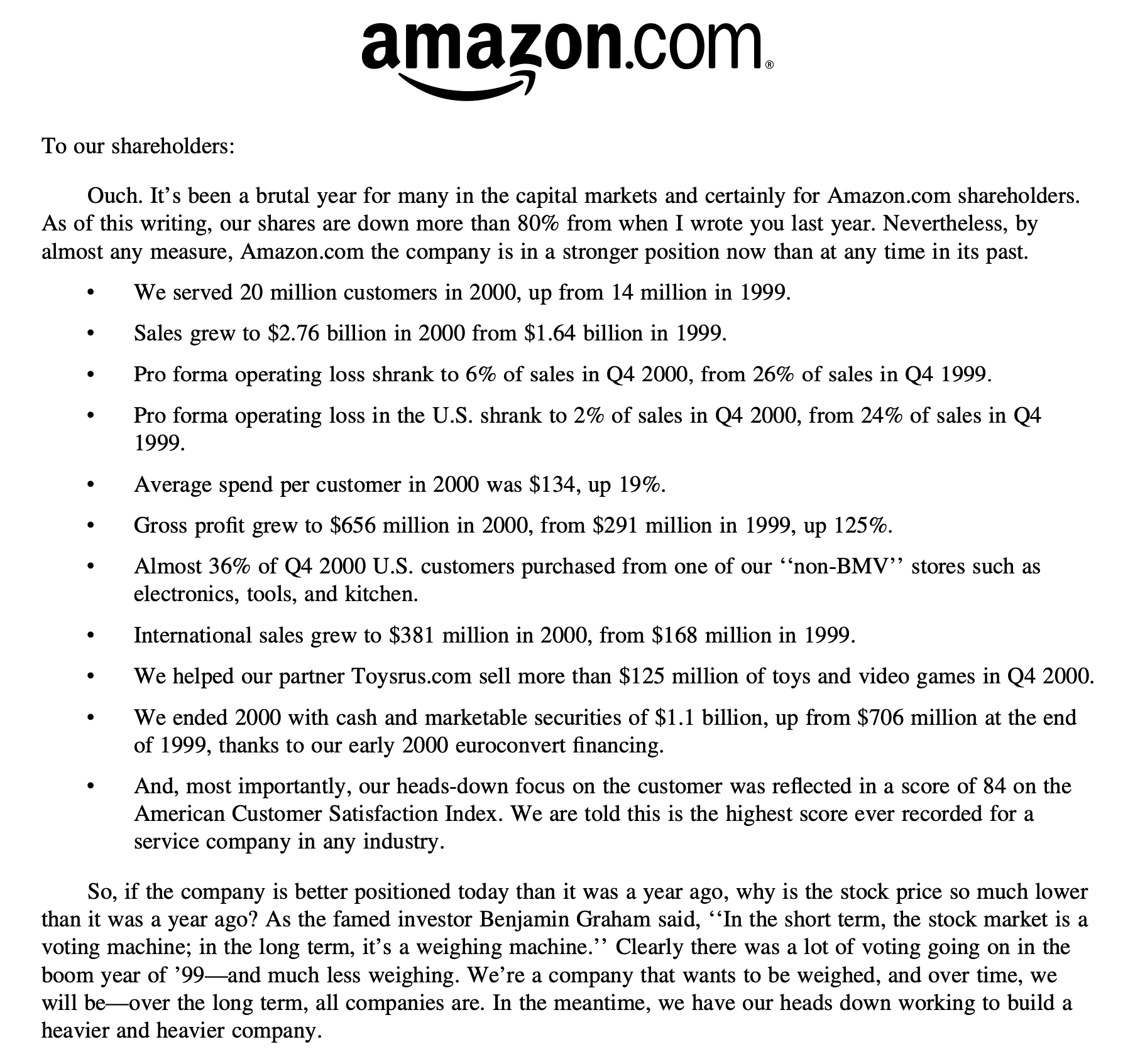 In zijn brief aan de aandeelhouders begin 2001 keek topman Jeff Bezos terug op een extreem zwaar jaar voor Amazon.com. De aandelen waren meer dan 80% gedaald ten opzichte van een jaar eerder. Toch benadrukte hij dat het bedrijf in werkelijkheid sterker stond dan ooit tevoren.